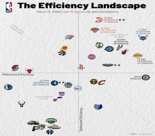 觀察最近10場比賽的攻防效率圖,不難發(fā)現(xiàn)湖人隊已然成為攻防兼?zhèn)涞膹婈?。他們的進攻效率位列第三,防守效率也躋身前11,凈效率更是高居聯(lián)盟第三。盡管湖人隊接下來的賽程略顯艱難,但球迷們?nèi)云诖麄兡軌虮3之斍盃顟B(tài),為季后賽做好充分準備。