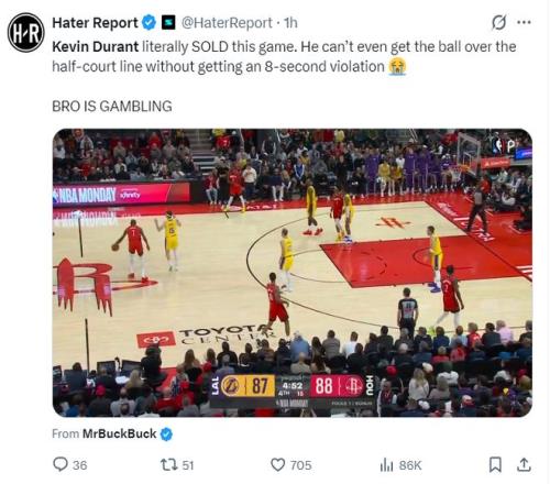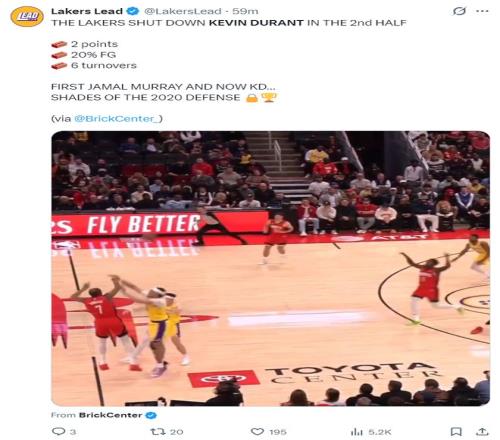 湖人媒體Lakers Lead還專門制作了杜蘭特整個下半場的拉胯集錦,各種的被包夾失誤、出手打鐵等等。