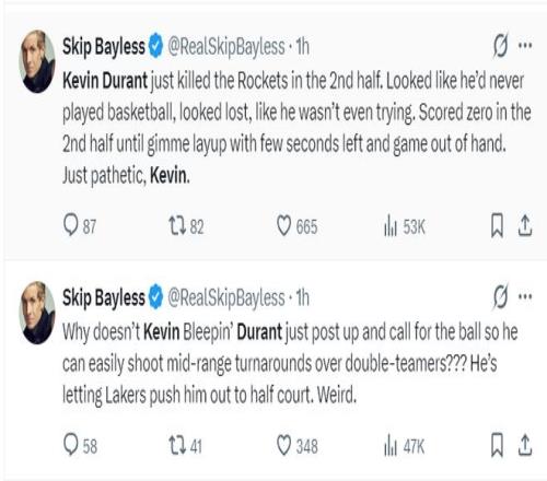 名嘴斯利普-貝勒斯瘋狂朝他開炮:為什么KD不直接突破到籃下?他可以打無球啊,這樣他就能輕松躲過雙人包夾接球完成中距離投籃。他持球就被湖人逼到半場的位置,太奇怪了。
