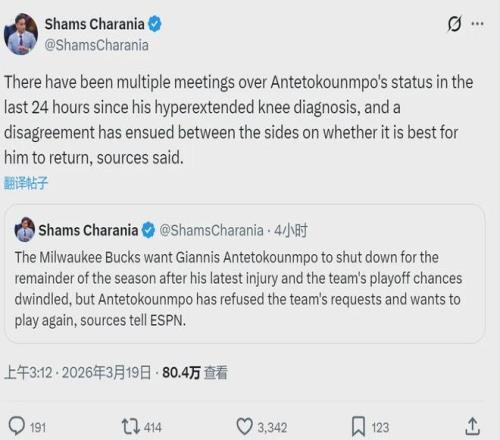 隨后Shams在節(jié)目中表示:“字母哥遭遇左膝過度伸展和骨挫傷,一周后接受復(fù)查。這是他本賽季的第五次受傷,管理層希望他不要再打了。字母哥向雄鹿總經(jīng)理霍斯特及工作人員明確表示,他不會(huì)選擇賽季報(bào)銷,本賽季一定要復(fù)出?!?/p>