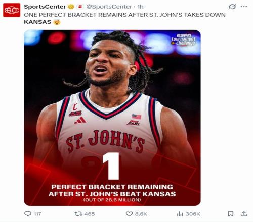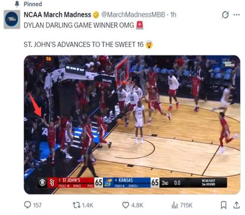北京時間3月23日,NCAA瘋狂三月錦標(biāo)賽32進16強,圣約翰大學(xué)67-65擊敗堪薩斯大學(xué)晉級16強。要知道堪薩斯大學(xué)是四號種子,圣約翰大學(xué)完成了奇跡一戰(zhàn),這是他們隊史1999年來首次進入甜蜜16強,換言之就是27年的紀(jì)錄。