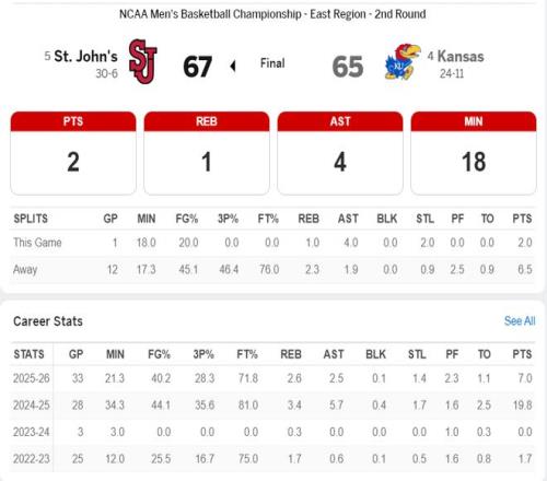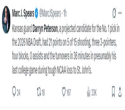NBA記者馬克-J-斯皮爾斯談到這場比賽,堪薩斯大學(xué)后衛(wèi)彼得森預(yù)計是2026年NBA狀元熱門,但在NCAA16強賽被圣約翰大學(xué)爆冷,他15中5拿21分3失誤0助攻,這可能是他大學(xué)生涯最后一場。