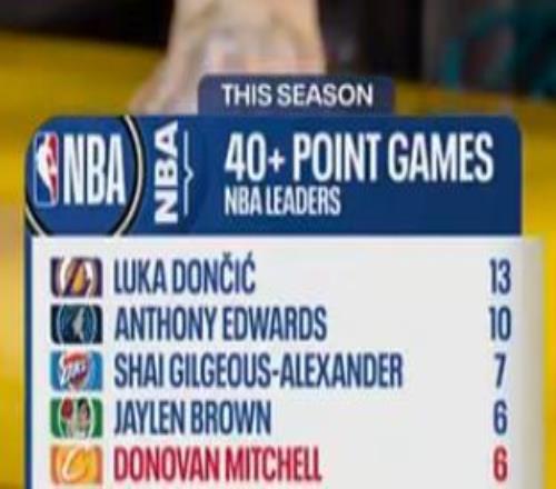 米切爾本賽季第6次得分40+,同期僅次于東契奇、華子和SGA