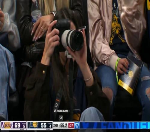 體育播報(bào)3月26日宣 NBA常規(guī)賽,步行者對(duì)陣湖人,克拉克客串場(chǎng)邊的攝影師。