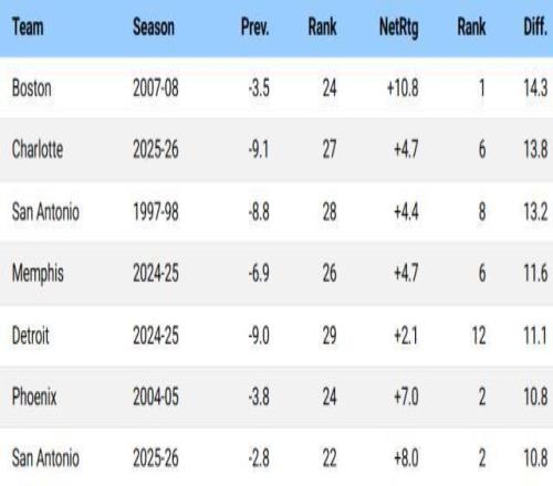 截至今日賽前,黃蜂本賽季百回合凈勝對(duì)手4.7分,排在聯(lián)賽第6。要知道上賽季黃蜂還以-9.1的百回合凈勝分排名聯(lián)盟倒數(shù)第4。短短一年時(shí)間,黃蜂將百回合凈勝分提升了13.8分,這在NBA進(jìn)入play-by-play數(shù)據(jù)時(shí)代的30年里高居第二,僅次于2007-08賽季組成加內(nèi)特、皮爾斯、雷·阿倫三巨頭的凱爾特人(提升14.3分)。