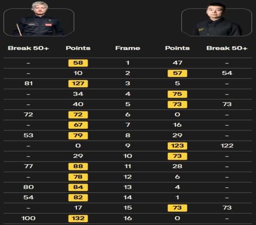 本場(chǎng)對(duì)決,尼爾?羅伯遜轟出一桿破百(100)外加六桿50+(81、72、53、77、80、54);龐俊旭打出一桿破百(122)和三桿50+(54、73、73)。