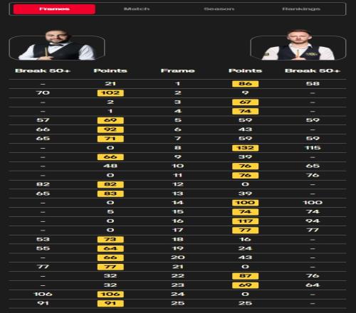全場(chǎng)比賽特魯姆普打出兩桿破百(115、100)和十桿50+(58、59、59、65、76、74、94、77、76、64),瓦菲打出一桿破百(106)和十桿50+(70、57、66、65、82、65、53、55、77、91)