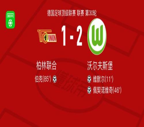 北京時間4月18日德國足球頂級聯(lián)賽 聯(lián)賽 第30輪,柏林聯(lián)合主場對陣沃爾夫斯堡。柏林聯(lián)合伯克破門。沃爾夫斯堡維默爾破門,佩契諾維奇破門。最終比分柏林聯(lián)合 1-2 沃爾夫斯堡。