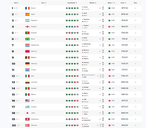 FIFA實(shí)時(shí)排名前20有18隊(duì)進(jìn)世界杯,意大利、丹麥無緣世界杯