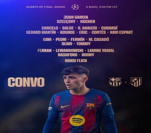 北京時間4月8日,巴薩官方公布對陣馬競的歐冠首回合大名單,亞馬爾、萊萬、阿勞霍在列,德容缺席。