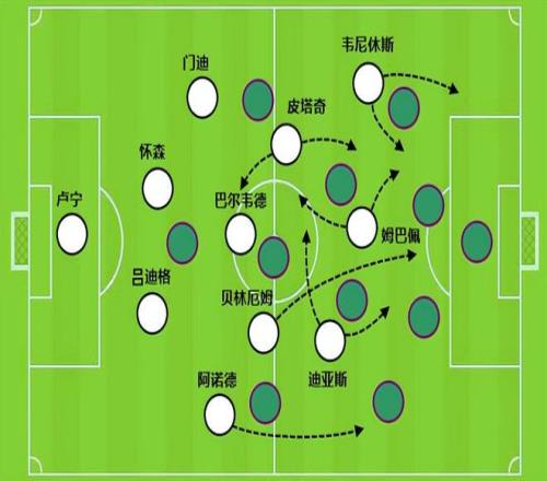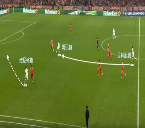 在反擊中,姆巴佩自己往往不跑在最前端,他會停留在前腰位置接應,同時又不愿意給韋尼休斯送出可能出現(xiàn)單刀的妙傳。