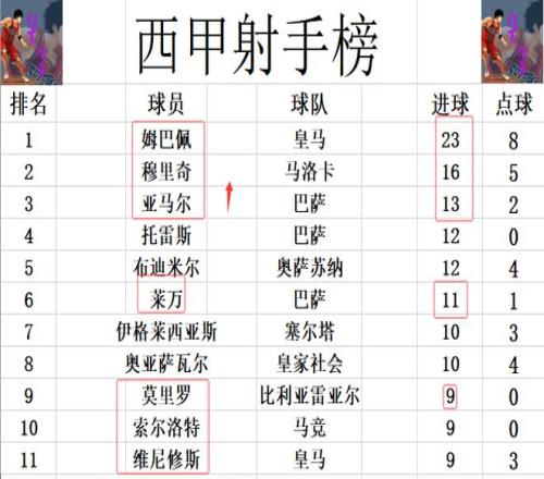 射手榜方面,姆巴佩23球領跑,穆里奇16位列第2。亞馬爾上演帽子戲法后一舉超過托雷斯等人,13球升到第3。萊萬最后階段打入1球,11球位列第6。莫里羅今天未能進球,還是和維尼修斯,索爾洛特等9球剛好擠入前十。
