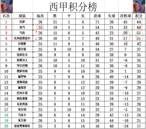西甲最新積分戰(zhàn)報巴薩大勝多皇馬4分繼續(xù)領跑馬競小勝沖進前3