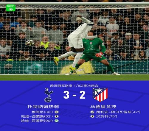 北京時間3月19日歐洲冠軍聯(lián)賽 1/8決賽次回合,托特納姆熱刺對陣馬德里競技。托特納姆熱刺穆阿尼破門,哈維-西蒙斯梅開二度。馬德里競技胡利安-阿爾瓦雷斯破門,漢茨科破門。最終比分熱刺 3-2 馬競。兩回合總比分熱刺5-7馬競。
