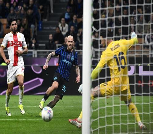 開場(chǎng)后,國(guó)米展現(xiàn)出了實(shí)力上的巨大優(yōu)勢(shì),而且率先利用定位球制造威脅,前15分鐘就有德弗里和阿坎吉在角球進(jìn)攻中制造出射門機(jī)會(huì)。之后,國(guó)米又在運(yùn)動(dòng)戰(zhàn)中發(fā)力,第16分鐘博尼在禁區(qū)內(nèi)抽射卻被對(duì)方門將神勇?lián)涑觯?6分鐘姆希塔良禁區(qū)外的遠(yuǎn)射碰到防守球員發(fā)生折射后擊中橫梁,而在第31分鐘又是博尼禁區(qū)內(nèi)的頭球攻門被門將拒之門外。這三次射門都極具威脅,但奈何對(duì)方門將和梅阿查的橫梁都有發(fā)揮,球隊(duì)也一直沒能破僵。