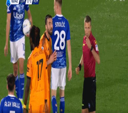 人數(shù)占優(yōu)的科莫隨即展開猛烈進(jìn)攻。第79分鐘,達(dá)庫尼亞右路突破后倒三角回傳,斯莫西奇第一腳射門被斯維拉爾撲出,但皮球落到門前的迭戈·卡洛斯腳下,后者開心撿漏補(bǔ)射再下一城,科莫2-1首次反超羅馬。