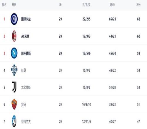 在積分榜上,國際米蘭以68分占據榜首位置,戰(zhàn)績是22勝2平5負。這一輪國際米蘭被亞特蘭大逼平。本來是身后的AC米蘭追分的好機會。沒想到AC米蘭爆冷落敗,導致與國際米蘭的差距變大了。AC米蘭60分,落后8分!那不勒斯以59分排名第3。法布雷加斯率領科莫這匹大黑馬擊敗羅馬之后,殺入歐冠區(qū),排名第4。尤文圖斯53分,嗲到第5名。羅馬掉隊了,51分排名第6。