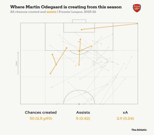 盡管厄德高只踢了聯(lián)賽總出場時間的38.6%,他仍是阿森納進(jìn)攻端貢獻(xiàn)最突出的球員之一。
