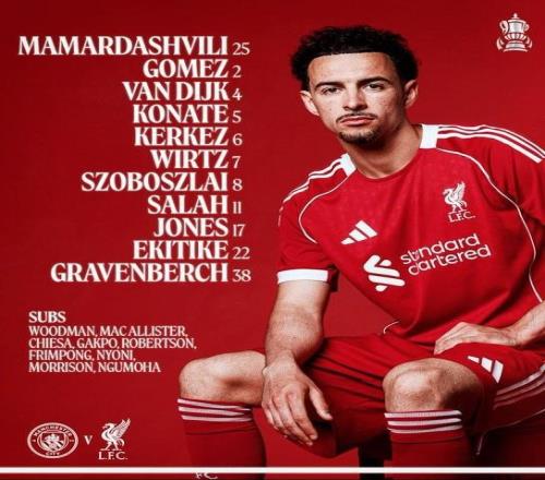 利物浦首發(fā):25-馬馬爾達什維利、2-喬-戈麥斯、5-科納特、4-范戴克、6-凱爾凱茲、38-赫拉芬貝赫、17-瓊斯、11-薩拉赫、8-索博斯洛伊、7-維爾茨、22-?;倏?/p>