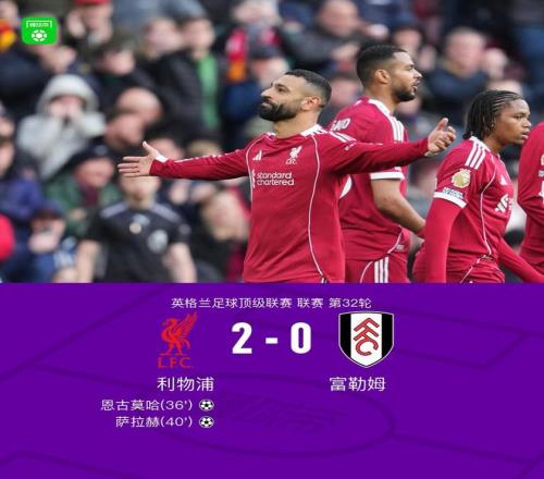 北京時間4月12日00:30,英超第32輪,利物浦主場對陣富勒姆。上半場,羅伯遜低射被封堵,加克波抽射打偏,哈里-威爾遜禁區(qū)內(nèi)兜射打高,恩古莫哈兜射破門,他也成為隊史英超打入2球最年輕的球員;隨后加克波助攻薩拉赫擴大比分。下半場,加克波禁區(qū)內(nèi)打門被擋出,麥卡利斯特爆射打偏,最終,利物浦2-0富勒姆。