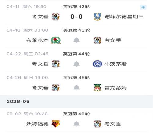 考文垂未來賽程,還剩4輪比賽,只差1分升入英超