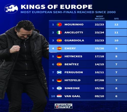 新世紀(jì)以來主帥歐戰(zhàn)半決賽次數(shù)榜:埃梅里9次,僅次瓜穆、安帥3人