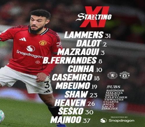 曼聯(lián)首發(fā):31-拉門斯、2-達(dá)洛特、3-馬茲拉維、26-海文、23-盧克-肖、37-梅努、18-卡塞米羅、8-B費(fèi)、10-庫尼亞、30-謝什科、19-姆伯莫