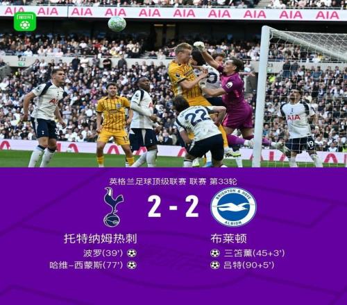 北京時間4月19日英格蘭足球頂級聯(lián)賽 聯(lián)賽 第33輪,托特納姆熱刺主場對陣布萊頓。上半場西蒙斯傳球,波羅前插頭球破門,半場補時階段格羅斯傳中,三笘薰精彩抽射扳平。下半場貝里瓦爾搶斷傳球,西蒙斯轟出世界波,全場補時階段,丹索被搶斷,范赫克助攻呂特補時破門。最終熱刺2-2布萊頓遭遇聯(lián)賽15輪不勝,繼續(xù)位列降級區(qū)。