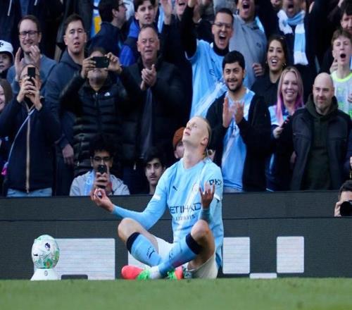 哈蘭德打入反超比分的進球后做出標(biāo)志性慶祝動作