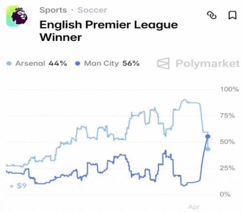 曼城在本輪聯(lián)賽2-1戰(zhàn)勝阿森納后,爭冠形勢迎來巨大反轉(zhuǎn)。據(jù)Polymarket最新奪冠概率數(shù)據(jù),曼城以56%反超阿森納,槍手當(dāng)前奪冠概率僅為44%。