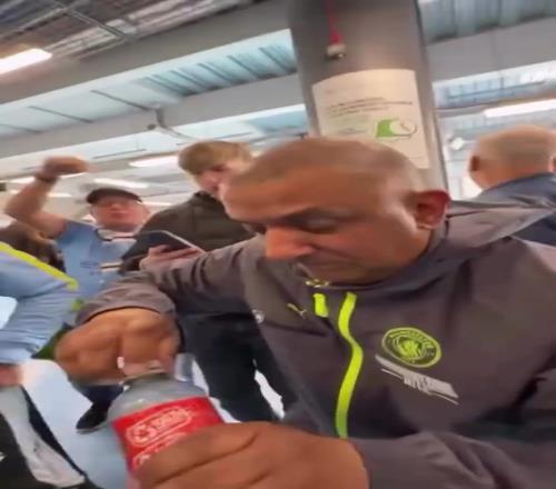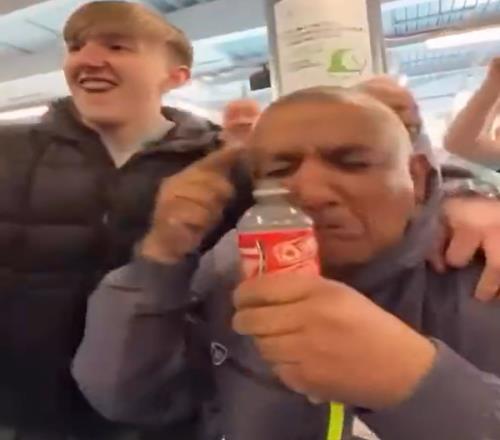 賽后曼城球迷“水瓶哥”擰開瓶蓋,接起了眼淚嘲諷。