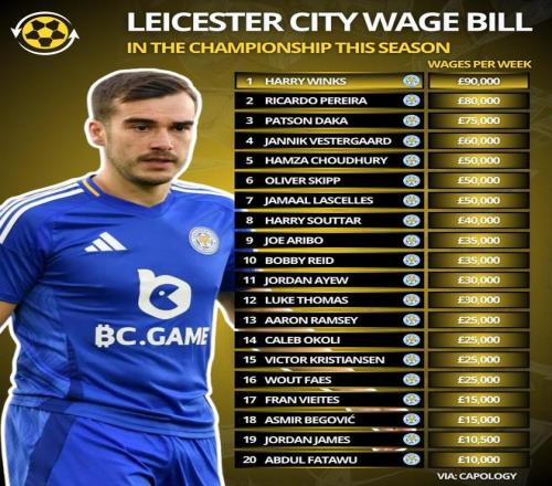 25-26賽季萊斯特城隊(duì)內(nèi)20人周薪: