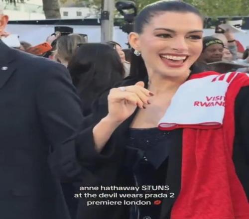 安妮-海瑟薇在出席《穿普拉達(dá)的女王2》倫敦首映禮時(shí)肩上搭了一件阿森納球衣。