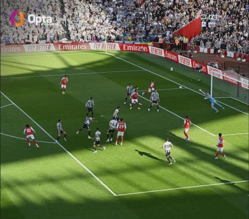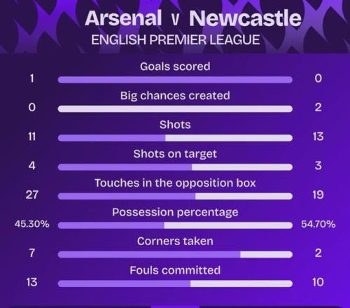 阿森納在射正次數(shù)、角球次數(shù)和對方禁區(qū)內(nèi)觸球次數(shù)上領(lǐng)先,但紐卡斯?fàn)栐趧?chuàng)造重大機(jī)會、射門數(shù)以及控球率上領(lǐng)先,這真的是一場非常接近的比賽。