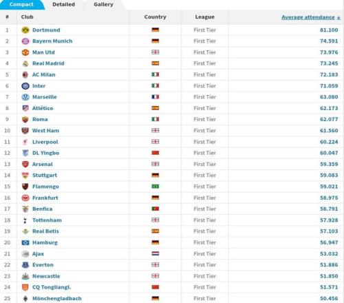 全球球隊(duì)主場(chǎng)平均上座人數(shù)TOP25: