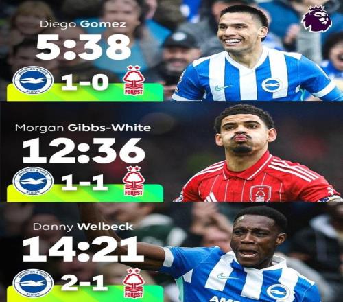 在比賽中,迭戈-戈麥斯在5分38秒為布萊頓首開紀(jì)錄,吉布斯-懷特在12分36秒為森林扳平比分,而維爾貝克在14分21秒幫助布萊頓再次領(lǐng)先。據(jù)英超官方統(tǒng)計(jì),這是本賽季英超首次出現(xiàn)前15分鐘打入3球的情況。