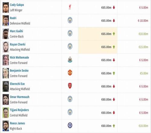3月9日,英超球員身價(jià)更新,薩卡降至1.2億歐,帕爾默降至1億歐,索博漲至1億歐,伊薩克下跌2000萬(wàn)歐,身價(jià)來(lái)到1億歐。