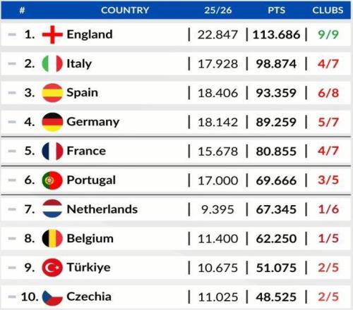 英超在歐足聯(lián)系數(shù)積分榜上遙遙領先