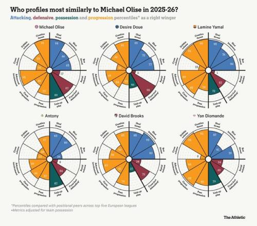 目前很少有左腳右邊鋒能達(dá)到更高的水準(zhǔn):在歐洲五大聯(lián)賽中,沒有人能比奧利塞的17次助攻更多。他擁有沉肩變向、在防守球員間穿梭以及在高速奔跑中完成致命一擊的能力,讓他成為足壇稀缺的“異類”球員。。