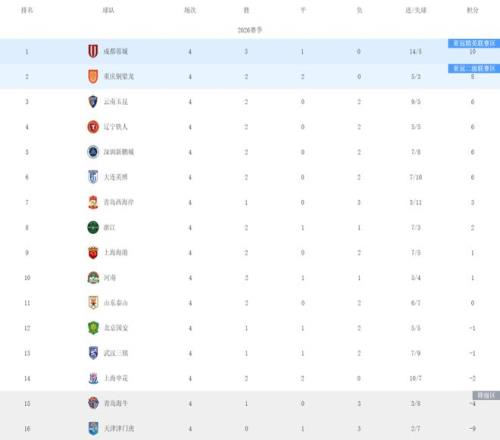 中超第四輪積分榜:5隊負分,蓉城穩(wěn)居第一,兩支升班馬進前四