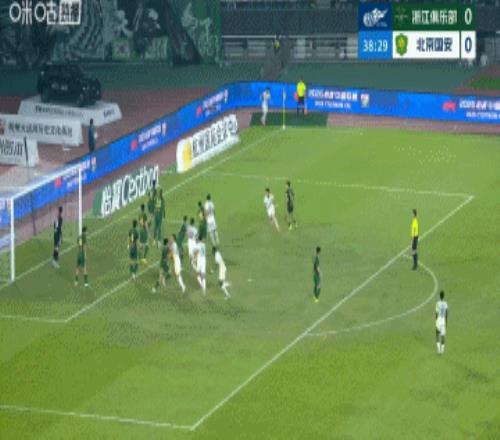 第39分鐘,國安右側(cè)角球開出,前點張玉寧頭球擊中邊網(wǎng)↓