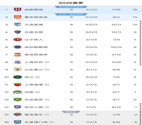 北京時間4月18日,隨著第二個比賽日2場比賽順利進行,中超聯(lián)賽第6輪比賽結束。6輪過后的積分榜,3支球隊保持不敗,西南三強格局被打破,二年級生大連英博升至第3,上海申花則沖到前8,3支球隊積分仍是負數(shù)。