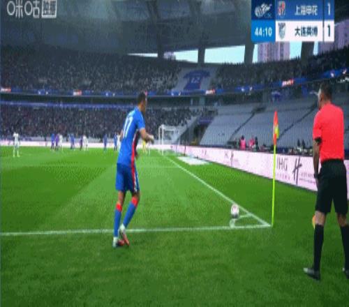 第44分鐘,高天意開右側(cè)角球,新外援蓋伊門將搶點(diǎn)頭球破門,申花2-1反超英博!