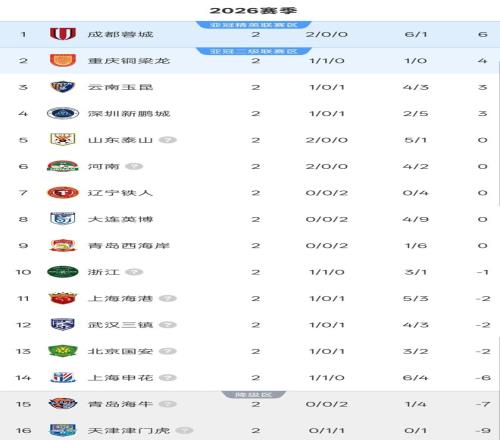 北京時(shí)間3月15日,隨著第三個(gè)比賽日3場(chǎng)比賽順利進(jìn)行,2026賽季中超聯(lián)賽第2輪比賽全部結(jié)束。2輪過(guò)后的積分榜,3支球隊(duì)奪得2連勝,成都蓉城6分繼續(xù)領(lǐng)跑,2支球隊(duì)完成“負(fù)分清零”,另有4隊(duì)有望下輪實(shí)現(xiàn)積分轉(zhuǎn)正。