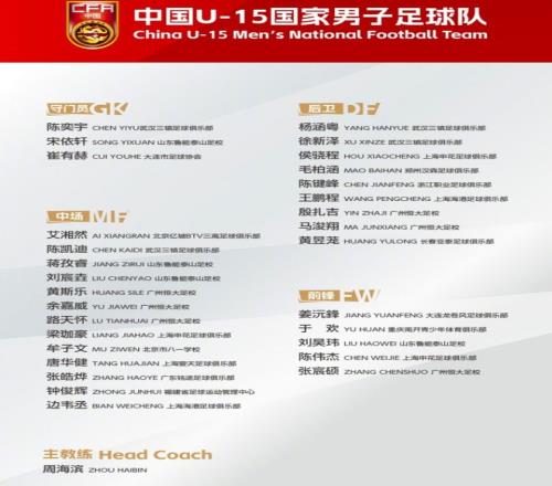 本屆U15男足的主教練是前國腳周海濱,30名運動員里,恒大足校有6人入圍,也是入選最多的。