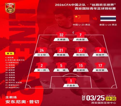 3月25日晚,2026西安國際青年足球錦標賽首個比賽日,中國U23隊坐鎮(zhèn)西安國際足球中心,迎戰(zhàn)泰國U23隊。賽前,雙方首發(fā)名單出爐。