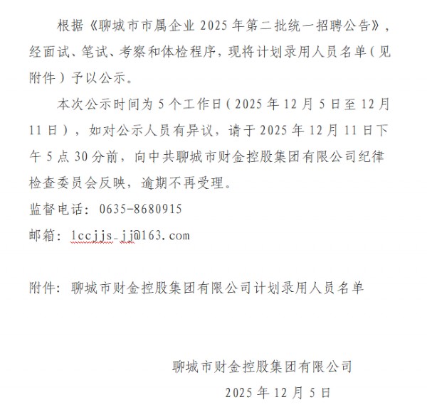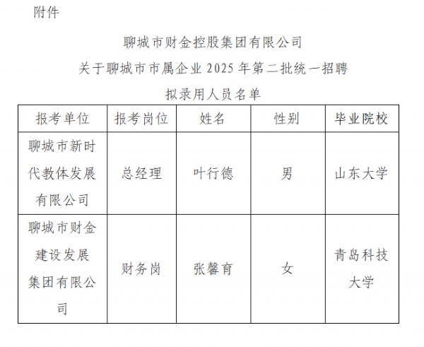 聊城市財金控股集團有限公司關于聊城市市屬企業2025年第二批統一招聘公告擬錄用人員公示