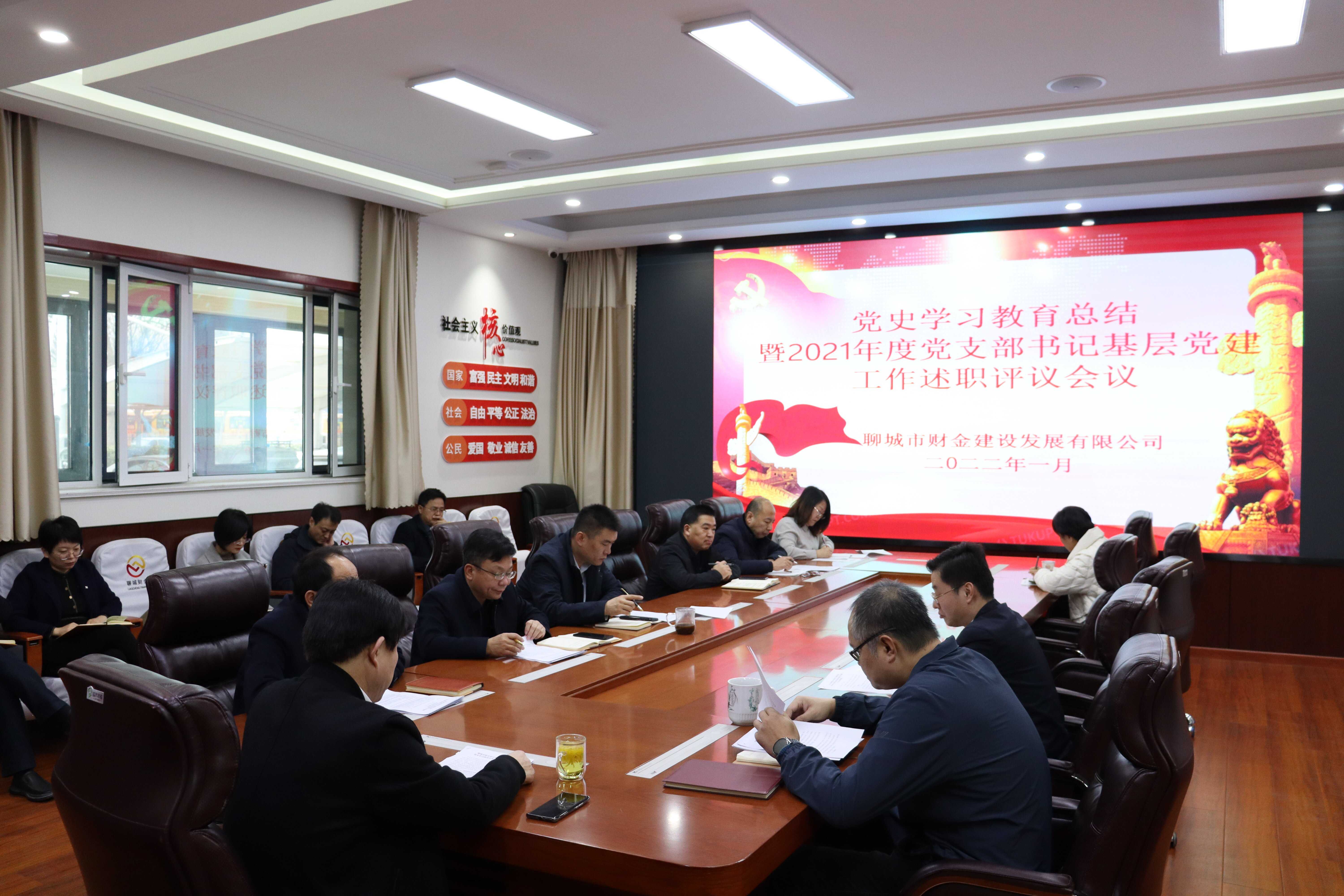 1月26日,市財金公司召開黨史學習教育總結暨2021年度黨支部書記基層黨建工作述職評議會議。黨委副書記、董事、總經理于雪格主持會議,領導班子成員、各黨支部書記、各部門及子公司負責人參加會議。