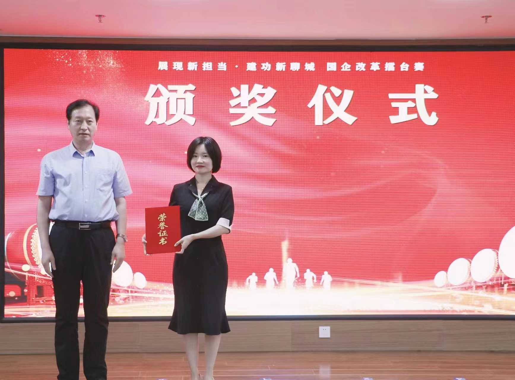 本次財金集團“構(gòu)建戰(zhàn)略人力資源管理體系·助力國企發(fā)展提質(zhì)增效”案例榮獲“展現(xiàn)新?lián)?dāng)·建功新聊城”國企改革擂臺賽”一等獎,由金同元主任親自頒發(fā)榮譽證書。
