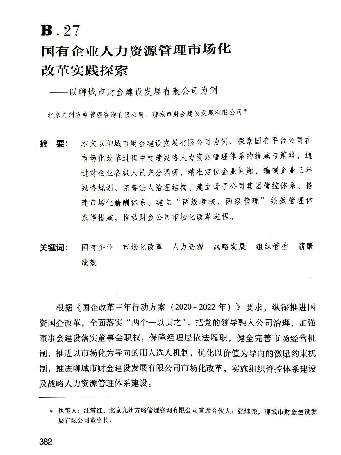 近日,中國人事科學研究院發布《中國企業人力資源發展報告(2022)》,聊城市《國有企業人力資源市場化改革實踐探索案例---以聊城市財金建設發展集團有限公司為例》入選。該報告屬于《人力資源藍皮書》系列,由中國人事科學研究院出版(隸屬于中華人民共和國人力資源和社會保障部),是我國干部人事改革、人才資源開發、人力資源管理和公共行政學研究的唯一國家級專業研究機構,是中央人才工作協調小組辦公室命名的“人才理論研究基地”。此報告為年度出版,匯集了央企和地方國企、知名民營企業和外資企業在人力資源開發與管理、人事制度改革創新等方面的實踐探索,為我國企業人力資源開發和管理工作提供了借鑒,為政府政策的制定提供了參考。2022年度中國人力資源發展報告共入選7篇案例,除市財金集團為地市級國有企業外,其余均為軍工、能源、運輸類央企。